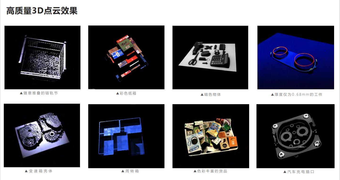 当3D相机成功解决了黑色反光工件的识别问题后,机器人可以精准地抓取摆放无序的黑色金属零件、手机外壳实现自动化上下料。对汽车发动机缸体、变速箱等复杂黑色铸件进行全尺寸自动化检测,替代易出错的人工卡尺测量。以及引导精密装配等。