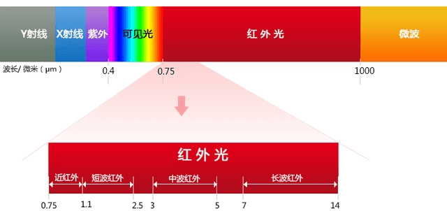 红外光根据波长不同,一般分为近红外、短波红外、中波红外和长波红外。