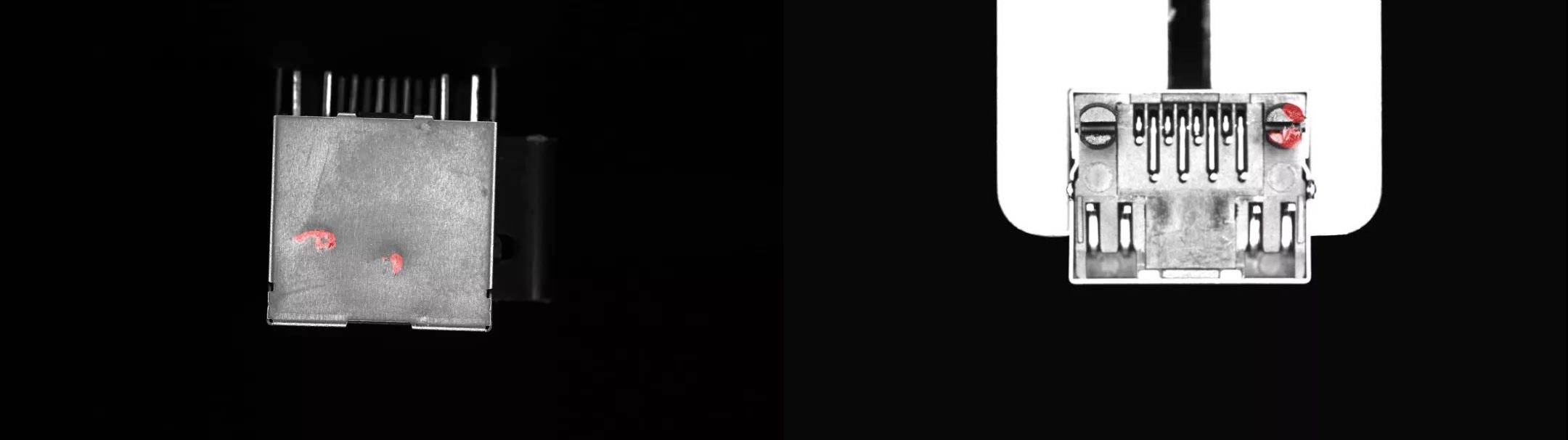 项目需检测 RJ45 接插件顶面、侧面和 Pin 针插孔等各功能区的外观缺陷。RJ45 接插件各表面的材质不同且外观缺陷种类较多,部分外观缺陷如金属面划伤、注塑面凹坑等缺陷成像较弱且容易受背景干扰。